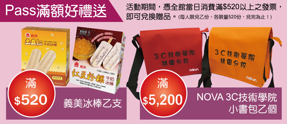 ◎活動內容:消費滿$520,即可免費獲得義美冰棒乙支,滿$5,200送3C技術